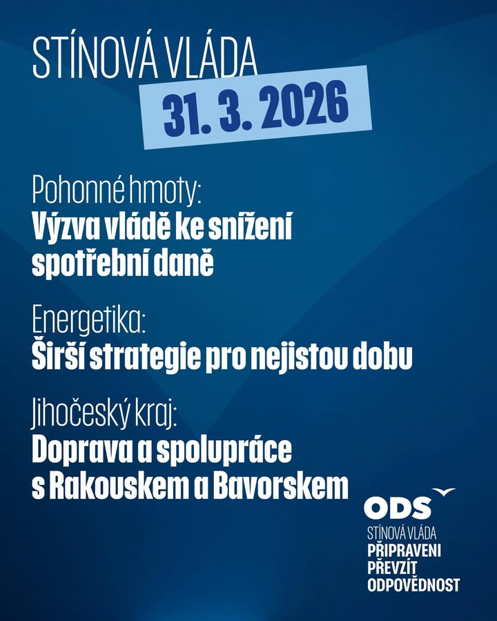 Druhé jednání stínové vlády ODS a zároveň první výjezdní zasedání v regionech! V Českých Budějovicích zazněla jasná výzva vládě, aby neprodleně využila náš návrh k dočasnému snížení spotřební daně u pohonných hmot i potřeba širší strategie pro ene… příspěvek na Facebooku
