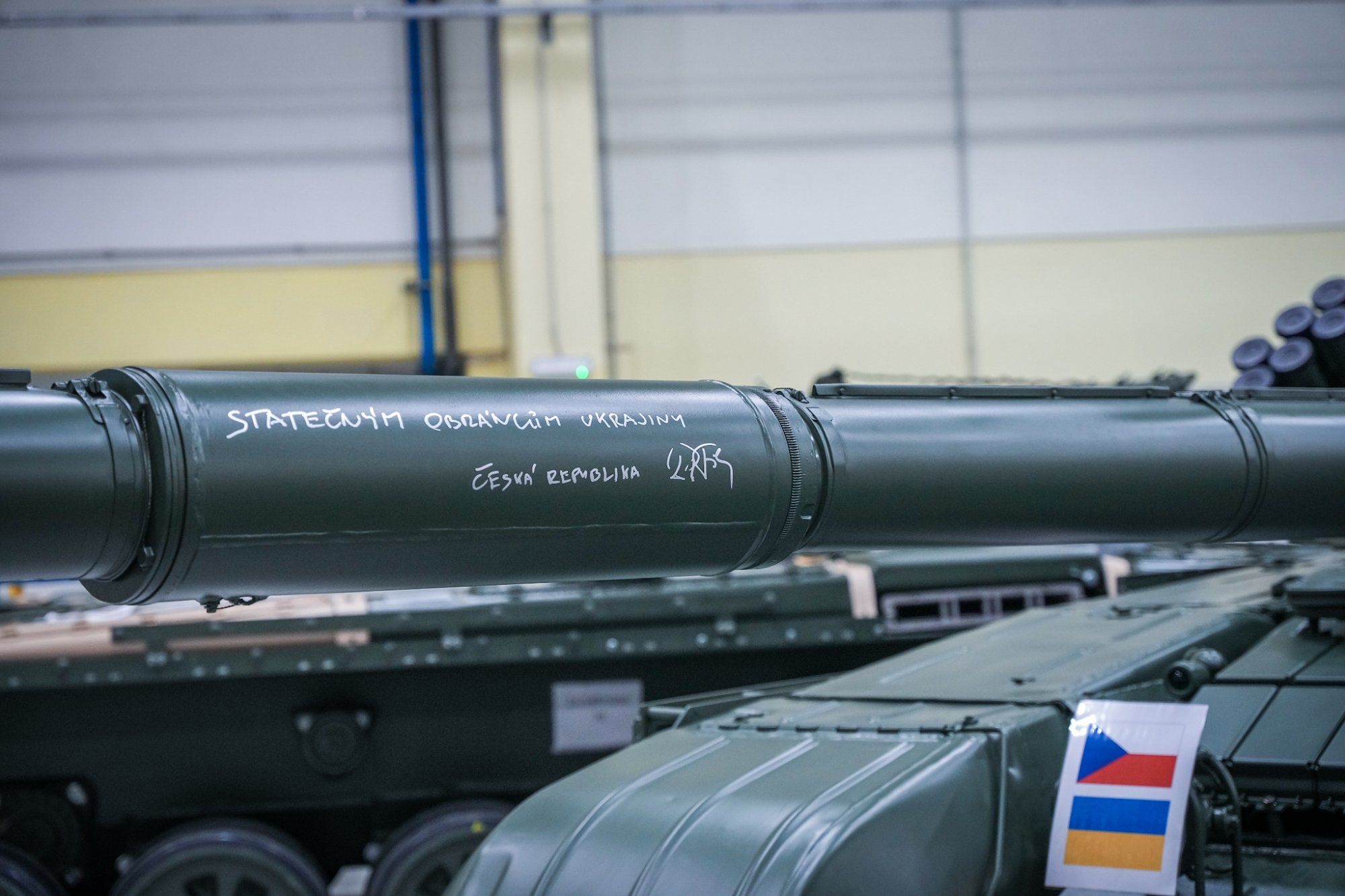Premiér Petr Fiala navštívil společnost Excalibur Army, na jeden z tanků, který poputuje na Ukrajinu, napsal i krátký vzkaz