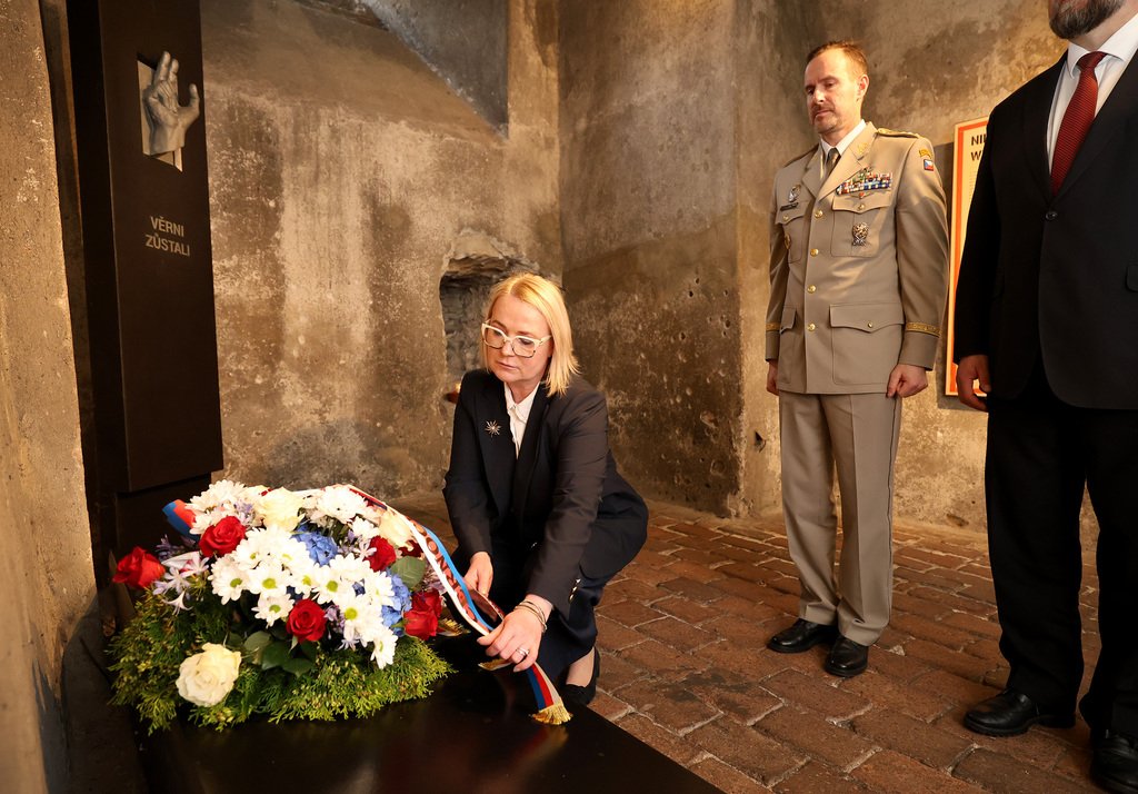 Ministryně obrany památku padlých, kteří se v kryptě chrámu před 82 lety skrývali po atentátu na Reinharda Heydricha, uctila nejprve v nedaleké Václavské ulici. Zde na místě, kam byla položena mrtvá těla hrdinů, zapálila svíčku.
