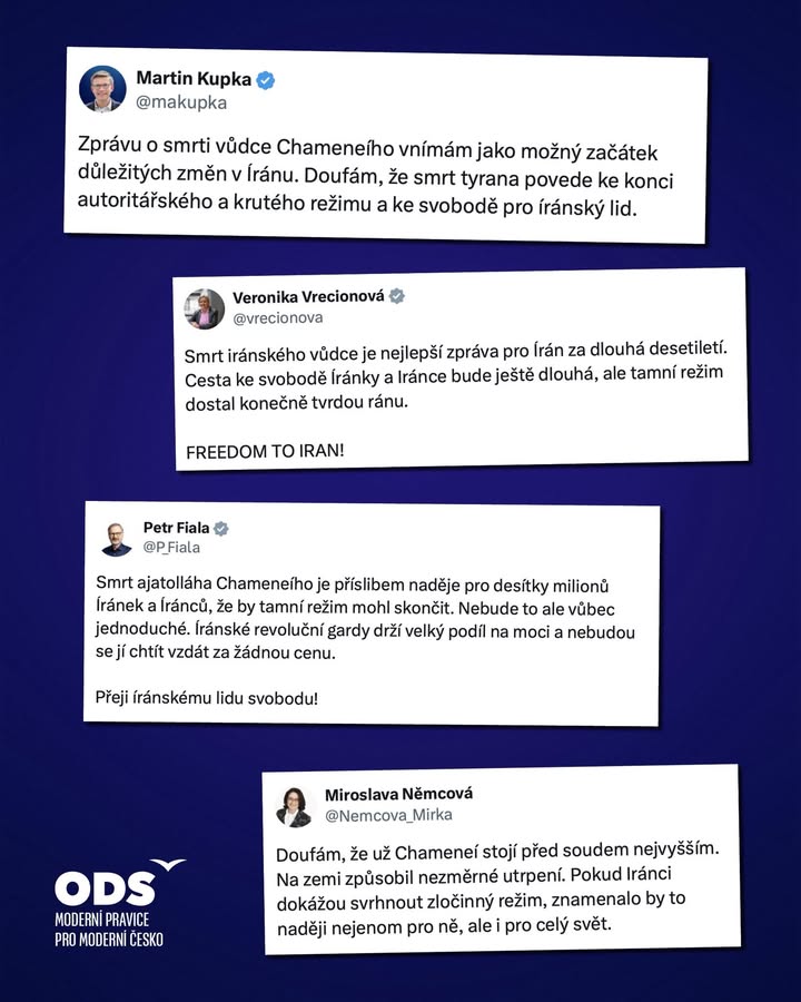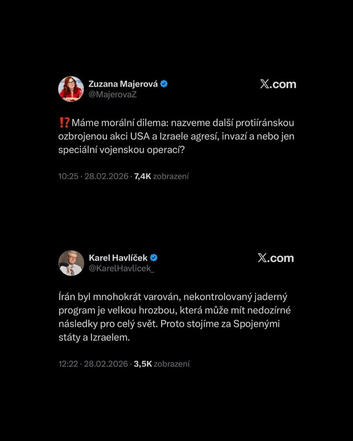 Trable v ráji, aneb poslanci vládní koalice se nemohou shodnout na tom, jestli podporují Spojené státy a Izrael, nebo jde o imperialistickou agresi proti mírumilovným ajatolláhům. ODS je jasně na straně našich spojenců! příspěvek na Facebooku