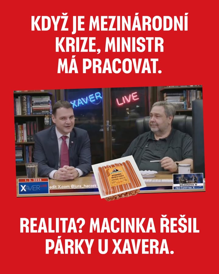 Komunikace ministra Macinky k tomu, jak vláda pomůže Čechům, kteří uvízli na Blízkém východě? Tragická. Ministr šel do obskurního streamu Xavera Veselého řešit párky místo toho, aby pracoval. příspěvek na Facebooku