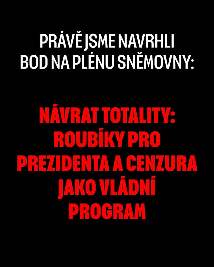 „Zítra na plénu Sněmovny navrhneme zařazení bodu Návrat totality: roubení prezidenta a cenzura jako vládní program.“