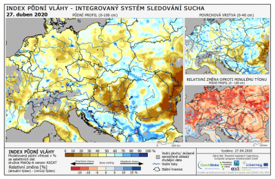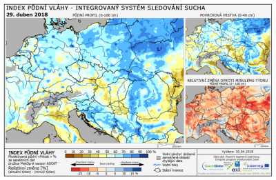 (ECHO24.cz) Trápí nás sucho. Už několik let po sobě. A nejen nás tady doma. Je to problém velké části Evropy. Od Německa přes Polsko, Česko, Maďarsko až do Itálie. První mapka ukazuje deficit vláhy v půdě na konci dubna. Druhá mapka ukazuje situaci koncem dubna 2018, kdy nás trápilo sucho naposled. Situace letos je výrazně horší. Těch pár kapek, které spadly přes víkend, na tom nic nemění. Pokud v květnu nezaprší, máme problém. Vloni sucho hrozilo také, ale zachránily nás dubnové deště.